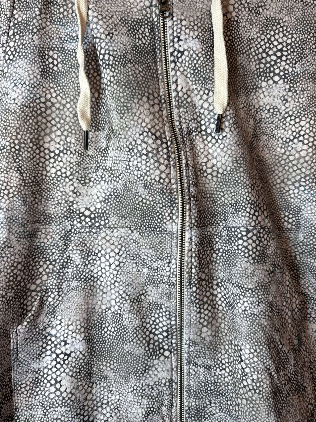 Conjunto de campera y pantalon con diseño tipo reptil en gris y blanco. La campera muy abrigada con peluchito y capucha